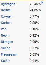 U hebt 2% gelijk, maar het is niet dat beetje ijzer en koolstof en magnesium dat maakt wat de zon is. Die 73,46% waterstof en 24,85% helium maakt dat de zon schijnt en ervan kunt genieten.