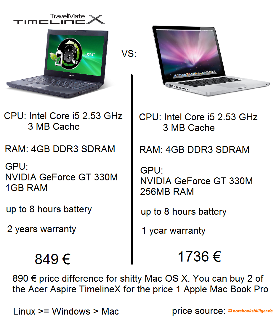 Waarom zou je bovenmaats veel meer geld willen betalen voor een flashy uiterlijk design, binnenin krak dezelfde hardware als bij PC, en geen mogelijkheid om zelf instellingen aan te passen of een upgrade uit te voeren? Daarbij komt nog eens dat je er de helft van de software voor Windows PCs niet onder kan draaien (i.t.t. Linux: Wine).