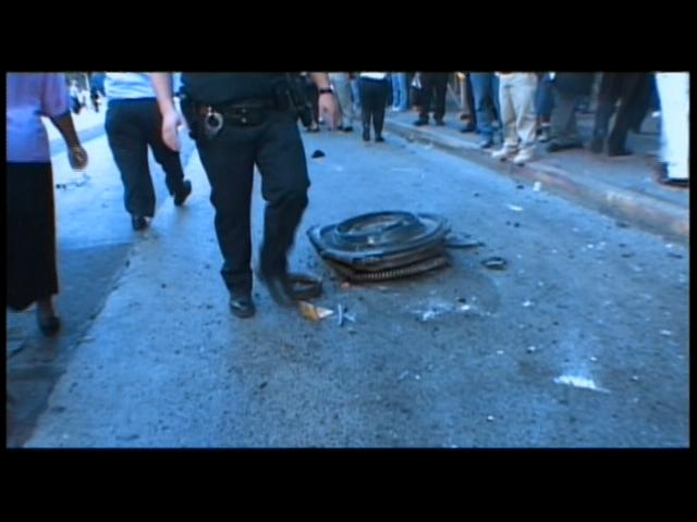 CNN Breaking News - America under atttack - Ja ? South tower redelijk schuin getroffen ... geel omcirkeld op de foto dat zou de rechterturbofan van een ??? ... kunnen zijn... "dalend" naar Murray street ? Citaat: