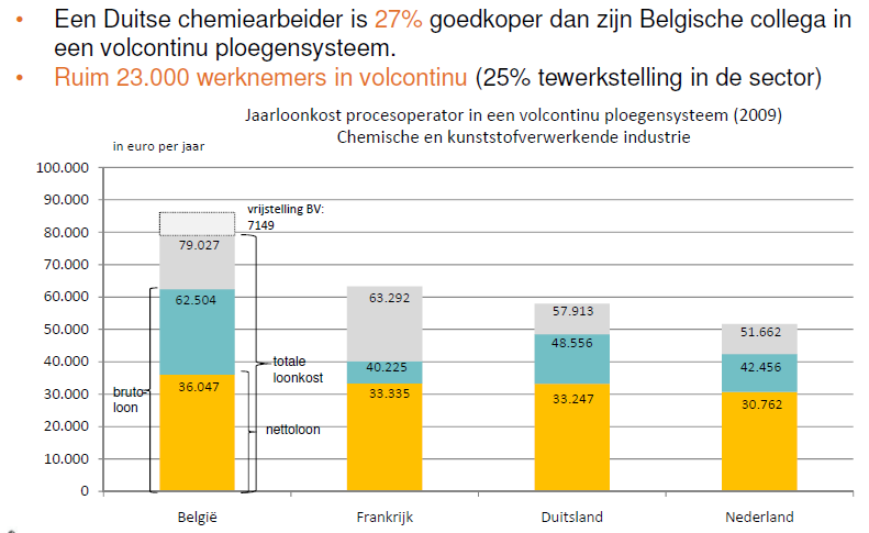 Maar er zijn wel probleemsectoren waar de hoge loonkost nefast is. Bijgaande figuur komt uit een studie van Deloitte&Touche. Daar zie je hoe vooral de sociale zekerheidsbijdragen voor shiftwerkers catastrofaal hoog zijn t.o.v. Duitsland.