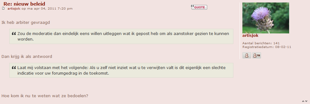 Scheld ik? Lanceer ik persoonlijke aanvallen? Geef ik te veel feiten met bron? Wat scheelt er aan mijn manier van uiten dat jij daar provocatie en/of ruzie stoken in ziet? (graag met citaat en link want er is hier al genoeg leugen en laster neergeschreven) |