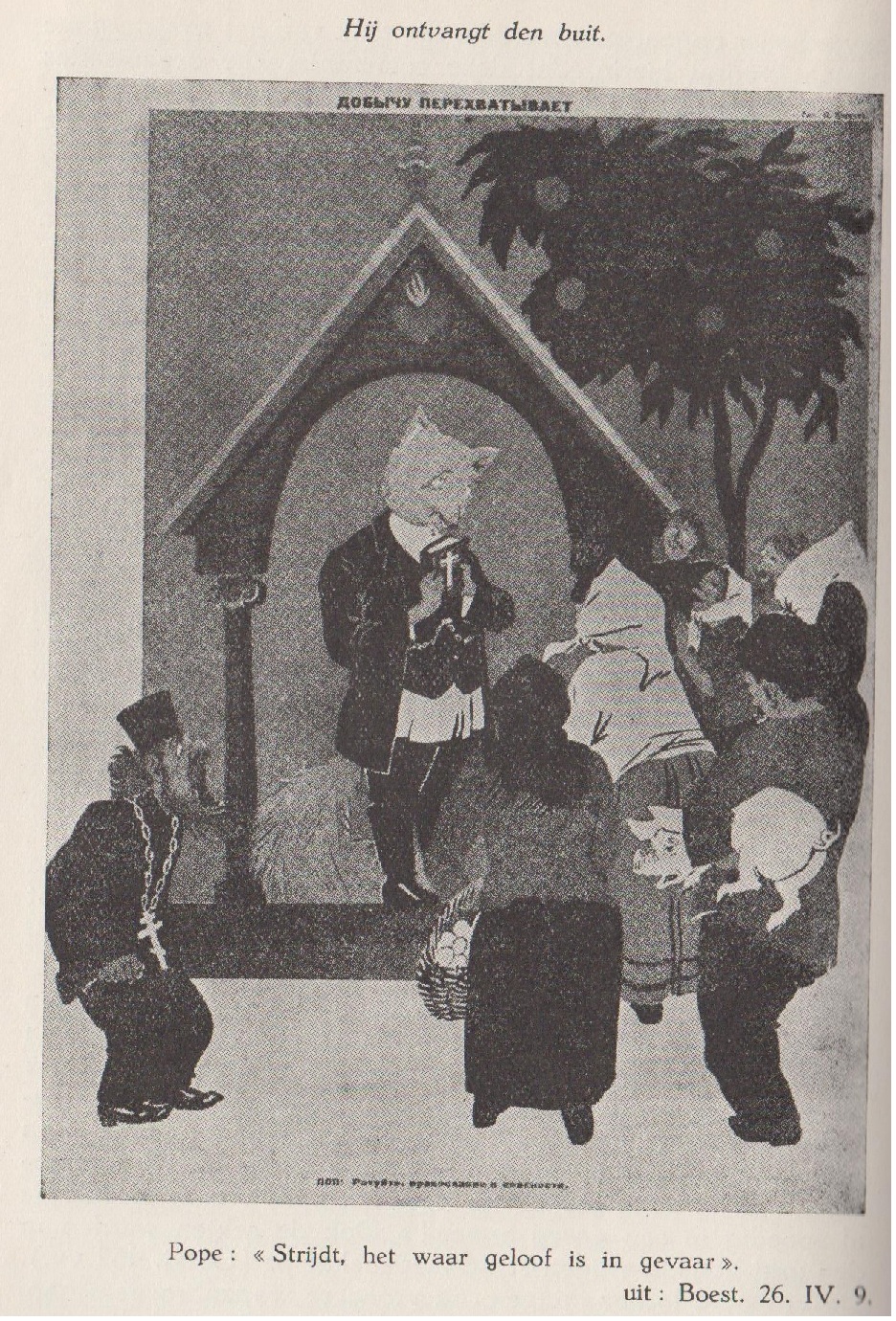 Alles wat eens uit haat tegen Rome door niet-katholieke belijdenissen tegen de RKK en haar opperhoofd werd uitgebracht, bevond zich ook bij de bolsjevieken geregistreerd. Zij ontleenden daarbij bij de evenzeer bekampte orthodoxen en de sekten. De paus werd gezien als aanstichter van alle oorlogen, als gehoorzame dienaar en agent van het Engelse, Franse en Amerikaanse kapitalisme. De grond van de Amerikaans-Mexicaans conflict lag bv. volgens hen daarin, dat de paus Mexico aan de Amerikaanse kapitalisten wou versjacheren. Men haalde uit de werken van Schulte en Strieder dat de paus over de hele kerkgeschiedenis zich hoofdzakelijk op geldspeculaties toegelegd had. Daarbij werd nadruk gelegd op aflaatverkoop, kwijtschelding van toekomstige zonden en de beruchte pausin Johanna. "Op de Roomse stoel zaten vele booswichten van het slag van Johannes, Alexander VI (Borgia) en dergelijken". De Jezuïeten werden als de "zwarte garde zijner heiligheid" afgeschilderd. Men zinspeelde op sexuele uitspattingen bij de belofte der kuisheid. Ook de zgn. "monita secreta" werden breed uitgesmeerd, en ook al nam men aan dat deze minstens gedeeltelijk op vervalsing berustte, argumenteerde men dat dat toch aantoonde waartoe de jezuïeten in staat waren. De bijgevoegde prent kadert dan weer in de nasleep van de Wall Street beurskrach en de daaropvolgende internationale crisis.
