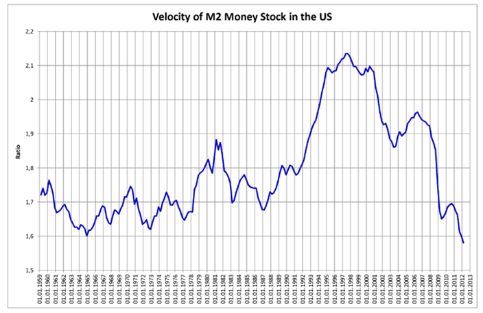 blogpost gepost op 8 januari 2013De circulatie van M2 blijft ondertussen dalen: is nu voor Q1 2013 = 1,533. Zie: http://research.stlouisfed.org/fred2/series/M2V/