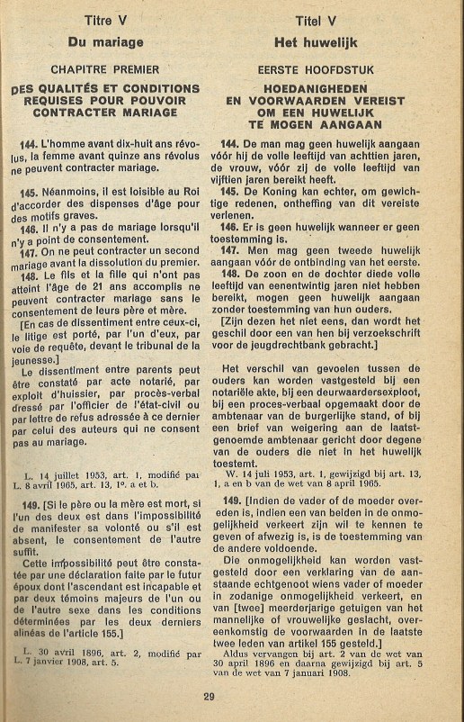 Toch nog even de puntjes op de i zetten. Wat de nummering betreft, dat laat ik in het midden. Blijkbaar is er inderdaad een en ander aan de nummering gewijzigd. Wat de inhoud betreft, zit je er echter compleet naast. Ik heb de moeite gedaan om even mijn oud exemplaar van het Burgerlijk Wetboek op te snorren en de pagina met het betreffende artikel in te scannen. Zoals je ziet, gaat het in artikel 144 over de leeftijdsvereiste, waarbij een onderscheid wordt gemaakt tussen de huwbare leeftijd voor een man en de huwbare leeftijd voor een vrouw. Daaruit valt niet af te leiden dat een man alleen met een vrouw kan of mag trouwen. De vereiste dat beide partners van verschillend geslacht moesten zijn, stond dus niet in het Burgerlijk Wetboek. Ook niet in de Franse tekst. Kortom: je bent verkeerd.
