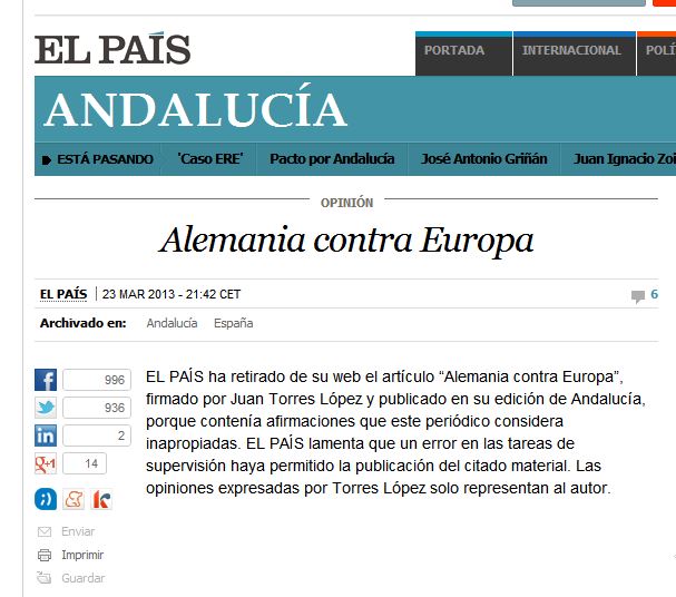 El Pais heeft overigens een minder positief stuk geschreven dat ze ijlings van het net hebben gehaald. Het bewuste artikel was van een zekere Juan T....... (jij mag het verder invullen). Het heette : Alemania contra Europa.
