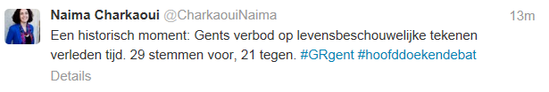![]() Ik denk niet dat moslims op dit moment de meerderheid uitmaken van de Gentse bevolking. En uiteraard moet men alleen reageren als dat voorstel wordt goedgekeurd door de gemeenteraad. Maar een grote kans bestaat dat bij een volksraadpleging de autochtone Gentse bevolking of te lui of te onverschillig is om zich naar het stembureau te begeven. Moslims zullen over dit thema extra gemotiveerd zijn de Imans en die drukkingsgroepen zullen hen daar wel toe oproepen. Maar dan is het een keuzen van de bevolking, onverschilligheid tegenover basiswaarden is een keuzen. Als men onverschillig is tegenover het principe van scheiding kerk en staat of neutraliteit of vrije meningsuiting betekend dat het evengoed mag afgeschaft worden, het heeft geen waarde.