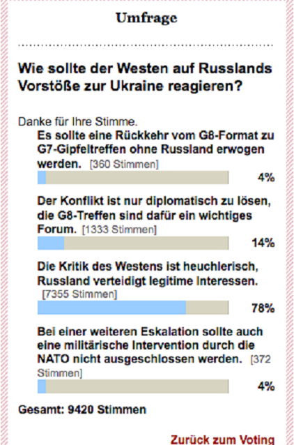 Enquete in Der Tagesspiegel in Duitsland: Hoe moet het Westen op de Russische houding ivm Oekraiene reageren???: Merkel en Nato gaan keihard op hun bek, enquete wordt doofpot ingestopt.