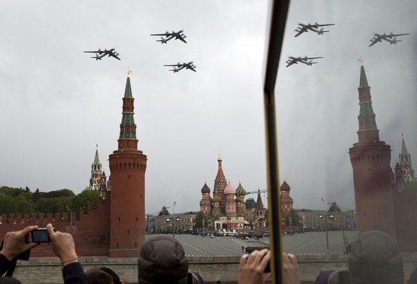 People watch as Russia's Air Force strategic bombers, Tu-95, fly over Red Square during a rehearsal for the Victory Day military parade which will take place at Moscow's Red Square on May 9 to celebrate 69 years of the victory in WW-II. BRON(fig.: Moskou, 7 mei 2014)