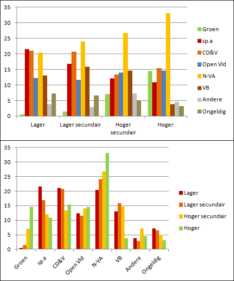 Kijk, Pericles en Knuppel: ik stel dat het VB relatief slecht scoort bij hoogopgeleiden. Omdat ook jullie het zouden begrijpen, in bijlage de statistieken uit dat onderzoek van de KU Leuven. Op de verticale as staan de behaalde percentages voor alle duidelijkheid.