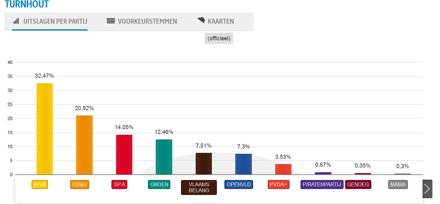 Kanton Turnhout - Gemeente Beerse: N-VA 42,37% - Gemeente Oud-Turnhout: N-VA 38,39% - Gemeente Turnhout: N-VA 32,47% - Gemeente Vosselaar: N-VA 39,50% Tja... |