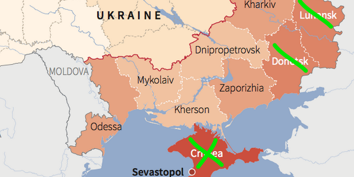 (fig.: het groene kruisje over de Krim is volledig, in Donetsk en Lugansk is de eerste streep van het kruisje gezet)