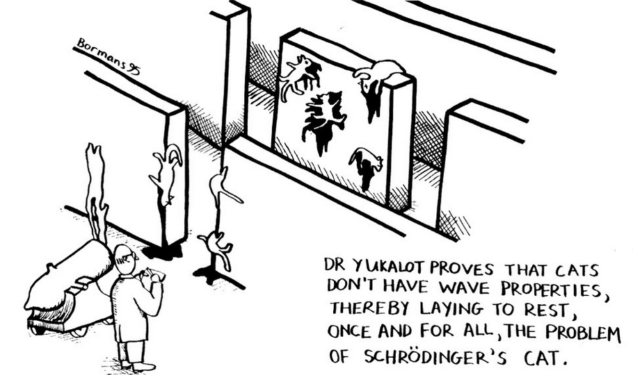 Een van de basissen van de kwantumwereld is het feit dat elementaire deeltjes zoals elektronen of fotonen in twee verschillende staten kunnen manifesteren. Enerzijds als golf of anderzijds als deeltje. Daar heerst dus een vorm van onbepaaldheid. Als men nu een klassieke proef doet zoals het twee spleten experiment om na te gaan hoe het zich gedraagt merkt men als die elementaire deeltjes door die dubbele spleten gaan een interferentie patroon vormt dat wilt zeggen dat het zich als een golf gedraagt. Als men de condities lichtjes wijzigt door een meetinstrument bij één van die spleten installeert blijkt die elementaire deeltjes zich te gedragen als een deeltje. Maar de onbepaaldheid golf/deeltje valt weg. Met andere woorden de omstandigheden bepaalt hoe een elementair deeltje zich gedraagt. Als die omstandigheden zich niet wijzigt is er ook geen verandering in het gedrag van die elementaire deeltjes. De omstandigheden determineren zijn eigenschappen. Schrödinger's kat is daar een allegorie van. Men weet niet of de kat nu dood of levend is, pas bij de meting (het openen van de doos) krijgt men zekerheid. Op dat moment vervalt die onbepaaldheid en wordt het bepaald (gedetermineerd). Om die reden is onze realiteit gedetermineerd, de onbepaaldheid van de kwantumwereld vervalt.
