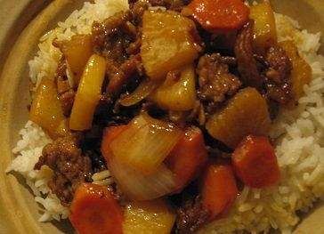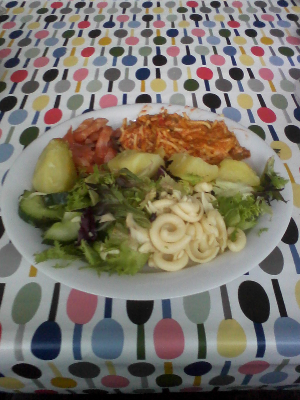 Kipsaté yakitori, en kip met rijst. Straks nog een pannenkoek met appel en caramel.