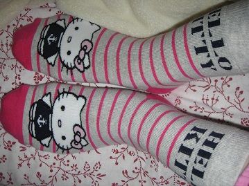 wat ik aanheb: roze jogging, beige t-shirt, lichtroze kamerjas, gespikkelde shorty, pantoffels en deze HK-sokken