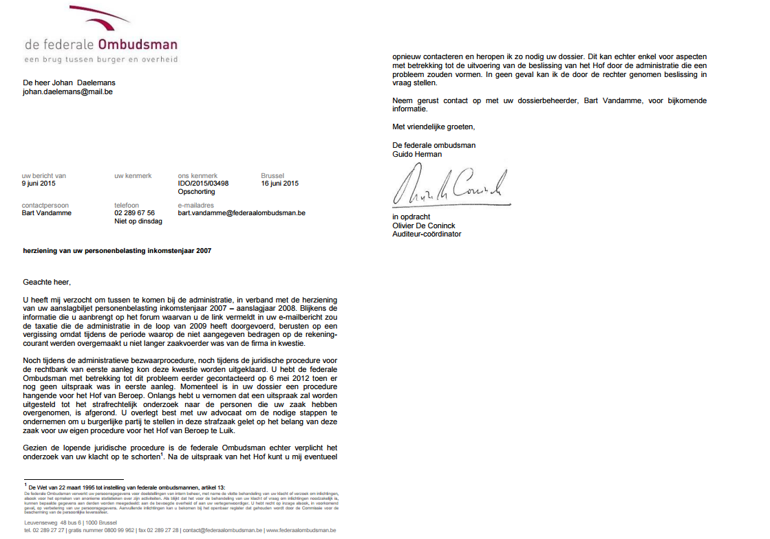 ![]() Neen, da's een standaard briefje waarmee de medewerkers van de federale ombudsman zich van werk ontdoen.