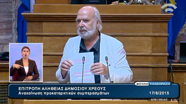"Ik ben nu al een vijftiental keren in Griekenland geweest. Ik herinner me nog goed die kolos van 800 pagina's die de Griekse parlementsleden hier moesten goedkeuren binnen de 24 uur. De ambtenaren van de Europese Commissie hadden toen verwittigd: 'Als dit niet gestemd is binnen de 24 uur, komt er geen storting van geld twee dagen later.' De aanvaarding van deze wetten werd dus meedogenloos doorgedrukt, door chantage van de schuldeisers."(fig.: Eric Toussaint toont op 17 juni 2015 een IMF-rapport van maart 2010 aan het Griekse parlement, waarin staat dat de leningen in het Europees memorandum van 2010 zullen leiden tot een humanitaire catastrofe)