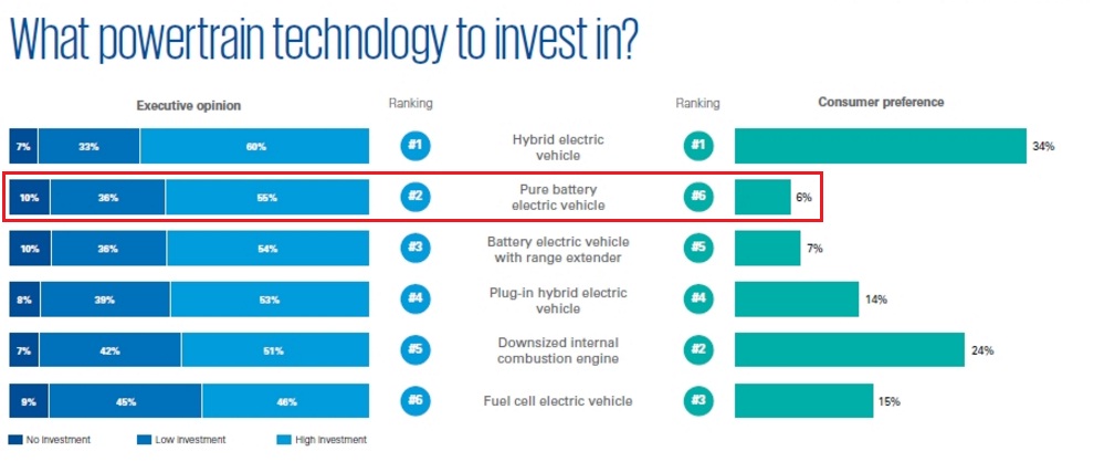 Hier staan de gebruikers en de executives lijnrecht tegenover elkaar. De gebruikers verkiezen een verbrandingsmotor met kleinere cilinderinhoud en staan zeer weigerachtig tegenover de full-electric. |