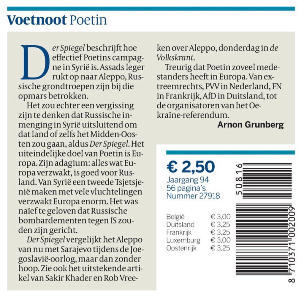 Onzin natuurlijk, en volksbedrog. Aleppo is grotendeels in handen van AL-Quaida, en ja die stoute Russen bombarderen die arme, onschuldige Al-Quaida strijders, hoe durven ze!