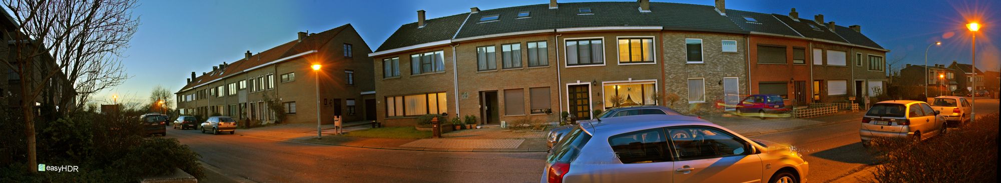 HDR gaat het effect nog versterken, vermits opnames met verschillende belichtingstijden gekombineerd worden. Het overbrugbare contrast neemt daardoor spectaculair toe. zie voorbeeld hieronder van een reeks HDR-opnames gekombineerd tot een panoramische opname. De straatlantarens zijn net niet overstraald, de schaduwen bevatten nog detail, de binnenverlichting vd huizen is perfect, de lucht is doortekend. Onmogelijk te doen zonder HDR. |