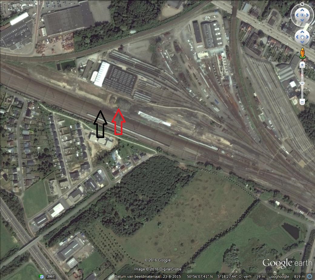 Op de luchtfoto, de rode pijl is waar ik stond toen ik de foto nam van de ingang van de nieuwe atelier en de zwarte pijl is waar ik stond toen ik de foto recht op recht nam.Met mijn rug richting bundel Afwisseling. Op de tweede foto die recht op recht is getrokken ziet u duidelijk dat de nieuwe atelier tussen de oude atelier staat en de bundel Afwisseling. Weeral een bewijs dat Cheminoke niet weet waar de nieuwe atelier juist staat. Cheminoke werkt niet eens voor de NMBS of voor Infrabel maar weet, volgens zijn eigen mening, beter hoe het in zijn werk gaat. Zelfverklaarde specialisten noen ik zo iemand. Cheminoke, hou u gewoon bezig met uw werk en laat iemand anders zijn werk, waar u niks van kent, doen. Bij deze dank ik u. |