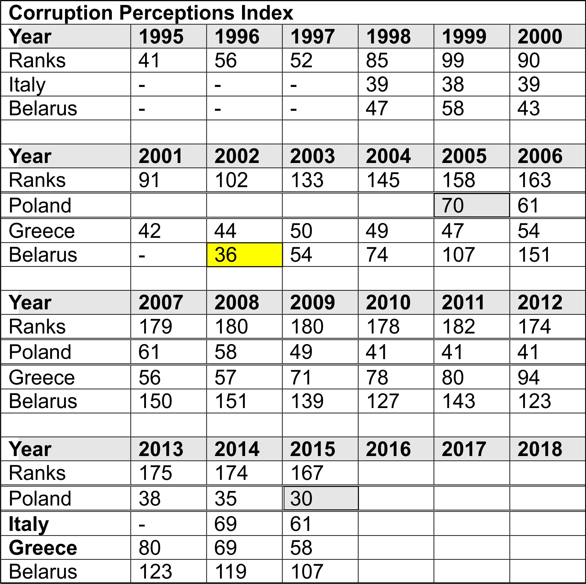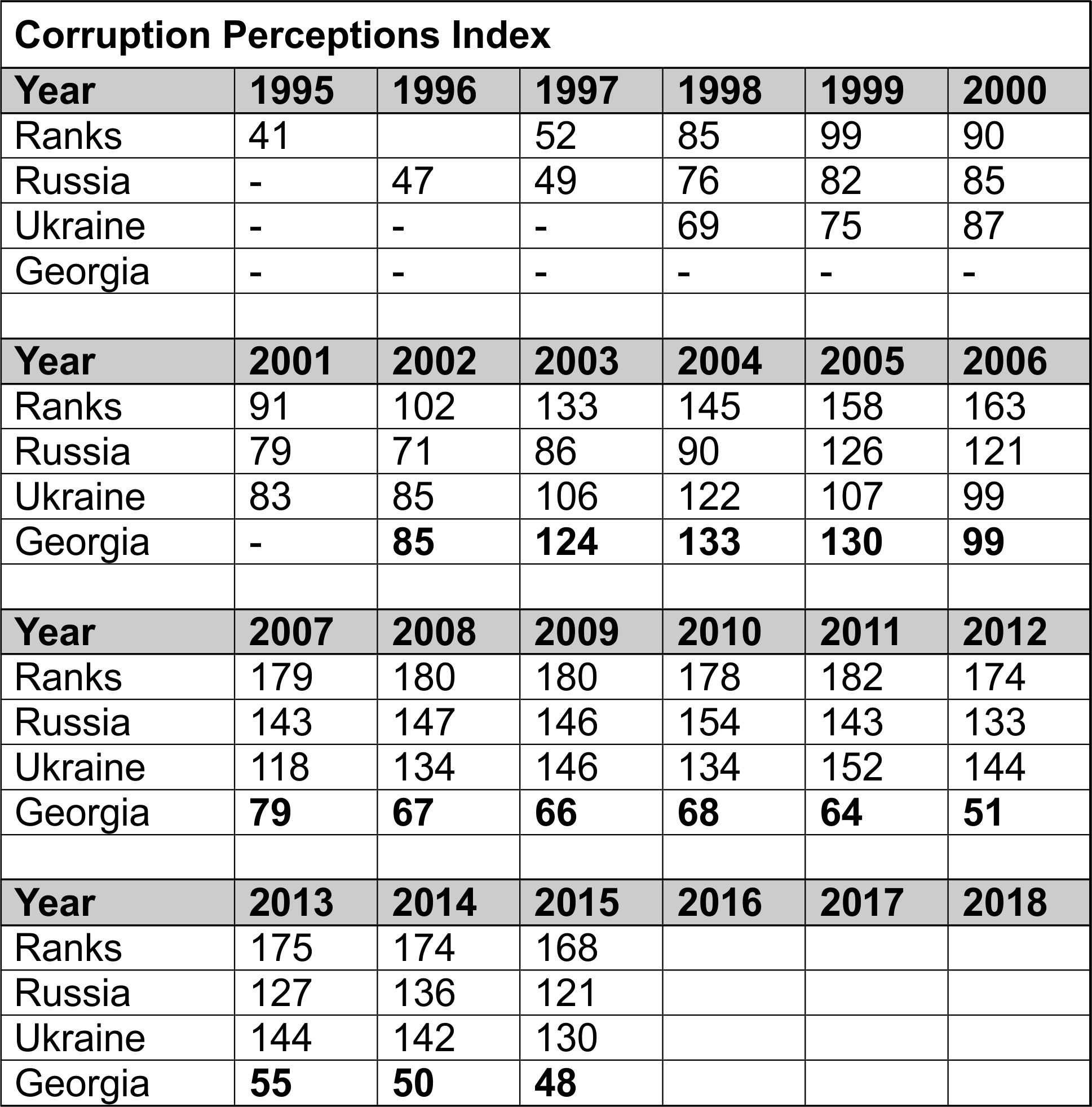 Aan de hand van de ranking list kunt u constateren dat de corruptie in deze landen gestaag tempo daalt. Als deze trend zich door blijft zetten zullen in ieder geval een aantal van deze landen de Noord Europese landen gaan benaderen. Opvallend is ook de corruptie in Georgia in sterk tempo gedaald Hoe graag u ook de Oekraïne aanhaalt als voorbeeld van corruptie, wat ik onder een fiks portie propaganda schaar, beide landen zijn door de jaren heen even corrupt geweest Excuus voor de fout 2015: Russia moet rank 119 zijn Laatst gewijzigd door Adrian M : 18 november 2016 om 12:40. |