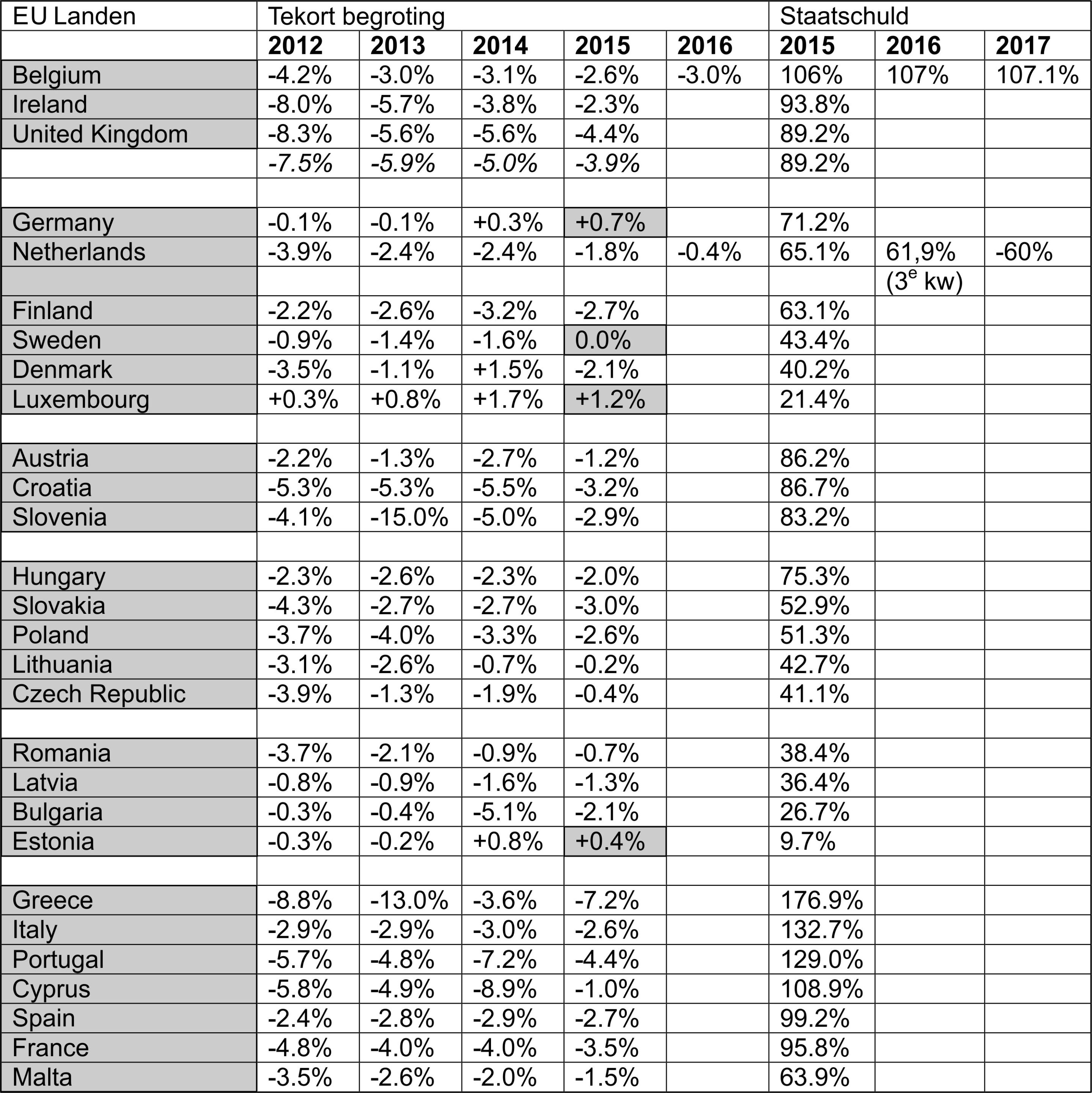(Excuus reactie met tabel, verkeerd geplaatst) De Benelux vergeleken met een aantal voormalige Oost-Bloklanden laat zien dat alleen Luxemburg er goed uitspringt Wat Nederland betreft is een trend te zien verbetering, maar biedt geen garantie voor de komende jaren. - Een Brexit van de UK zal flinke gevolgen hebben - Ingeval de PPV aan de macht klapt de zaak volledig in elkaar gezien het economisch model, een Nexit etc. De staatsschuld moet verder omlaag, als wel het begrotingstekort naar minder dan 0.0%. Ook het komende jaar wordt er €4 á €5 miljard bezuinigd 2015: tekort begroting -3% 1. Slovakia: -3.0% 2. Croatia: -3.2% 3. France: -3.5% 4. United Kingdom: -4.4% / -3.9% 5. Portugal: -4.4% 6. Greece: -7.2% 2015: geen tekort begroting 1. Germany: +0.7% 2. Luxembourg: +1.2% 3. Estonia: +0.4% 4. Sweden: 0.0% 2015 Benelux: begroting / staatsschuld 1. Luxembourg: +1.2% / 21.4% 2. Netherlands: -1.8% / 65.1% <> 2016: -0.4% / 61,9% (3 kw) 3. Belgium: -2.6% / 106% <> 2016: -3.0% / 107% In vergelijking met de Benelux een aantal Oost-bloklanden - Estonia: +0.4% / 9.7% - Bulgaria: -2.1% / 26.7% - Latvia: -1.3% / 36.4% - Romania: -0.7% / 38.4% - Czech Republic: -0.4% / 41.1% - Lithuania: -0.2% / 42.7% Laatst gewijzigd door Adrian M : 14 januari 2017 om 03:15. |
