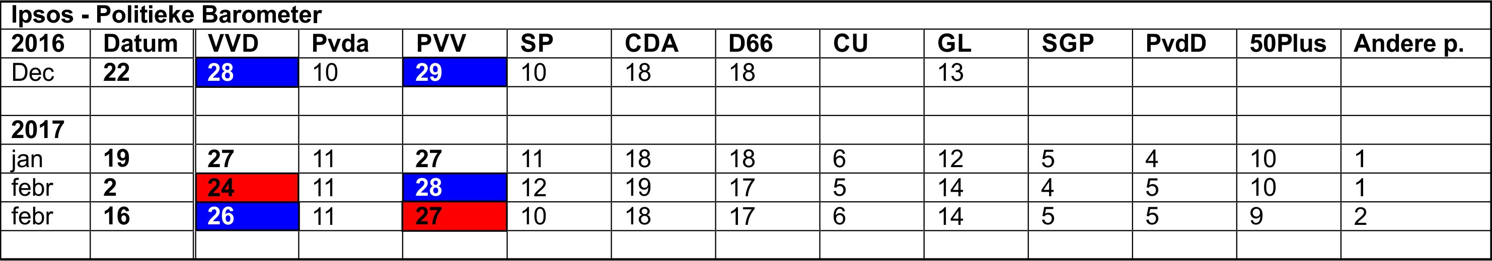 Nog 25 dagen te gaan, de afgelopen 4 á 5 weken weinig van te merken geweest dat dit het centrale onderwerp zou zijn De kleine partijen die dit als kernpunt hebben scoren voor geen meter - Jan Roos denkt met VNL, afsplitsing PVV, 4 zetels binnen te kunnen halen Gezien de peilingen wil het blijkbaar momenteel niet lukken om zelfs maar 1 zetel binnen te halen - Mister Baudet wil het ook al niet bar lukken met de FvD, nul zetels tot nu toe - Geen Peil, de voorvechters van het referendum, bleken geen standpunten te hebben waardoor de partij niet opgenomen werd in de kieswijzer. Blijft nog over de PVV. Wilders noemt het nog wel, maar het blijft momenteel op de achtergrond. Uit een onderzoek, oct 2016, zou blijken dat de overgrote meerderheid van de Nederlanders niet dermate tegen de EU zijn dat ze een Nexit zelfs maar zouden overwegen - Voor EU, enigszins voor: 66% - Tegen EU, enigszins tegen: 34% PVV aanhang Sterk voor EU: 4% Enigszins voor: 24% Totaal: 28% Sterk tegen EU: 32% Enigszins tegen: 40% Totaal: 72% Ook de Deutsche Bank gebruikte dit onderzoek om de Nederlandse situatie te beoordelen gezien de verkiezingen EenVandaag deed vorig jaar een peiling en kwam uit op 48% Nexit Het gemiddelde van het onderzoek en de peiling EenVandaag zou er op wijzen dat met de verkiezingen in aantocht een standpunt Nederland uit de EU geen zinvolle tactiek is. Uit de peilingen valt tevens op te maken dat de specifieke partijen op dat punt, Nexit - o.a. VNL, FvD - er niet mee scoren. VNL (Jan Roos, de voorvechter Oekraiene referendum, samen met Baudet FvD) - 30 jan: 0.620 zetels (53.320 kiezers) - 5 febr: 0.816 zetels (70.176 kiezers) - max behaald - 8 febr: 0.497 zetels (42.742 kiezers) - laagste aantal - 18 febr: 0.721 zetels (62.006 kiezers) Laatst gewijzigd door Adrian M : 18 februari 2017 om 13:37. |