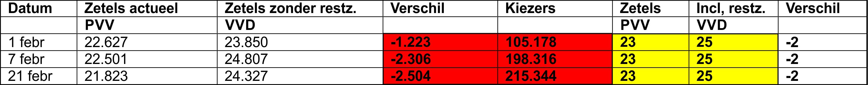 Geen enkel medium benadrukt dat een slachting heeft plaats gevonden Evenmin dat de PVV alleen bij de Hond nog op winst staat. Tevens geven ze het aantal zetels, inclusief restzetels, aan. PVV en VVD momenteel (Liss panel) Aangezien ook andere peilers 22 zetels aangeven komt dit ook bij hen neer op ongeveer 20.683 zetels voor de PVV, exclusief restzetels Het verschil wordt dermate klein met een enkele partij eronder dat de PVV de grens nadert gepasseerd te kunnen worden VVD: 25.693 zetels. Inclusief restzetels: 27 Verschil: -5.010 zetels (440.860 kiezers) |