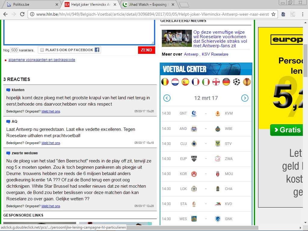 Uiteraard zou dergelijk statement NOOIT door de censuurmuur van HLN geraken. Maar hier lukte het toch : http://www.hln.be/hln/nl/949/Belgisc...-wachten.dhtml Reactie 2 heeft het hem gelapt. Laat Antwerp nu gereedstaan. Laat elke vedette excelleren. Tegen Roeselare uithalen met prachtvoetbal! Laatst gewijzigd door HOUZEE ! : 5 maart 2017 om 13:59. |