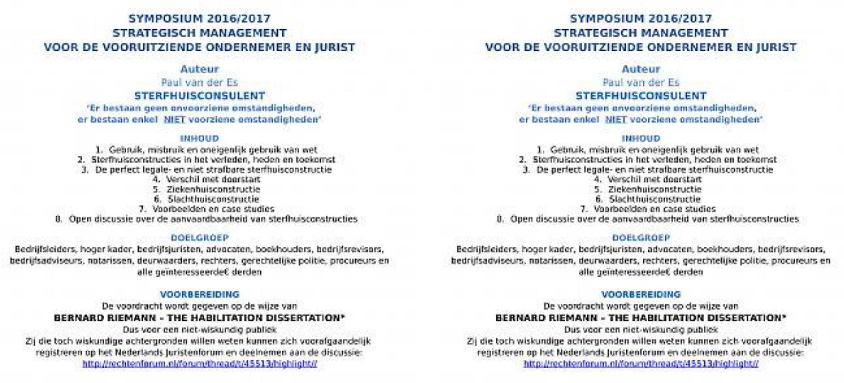 De andere voordracht is betalend en bedoeld om bijkomende inkomsten te genereren. Advocaten worden niet geweerd op de voordrachten maar worden niet meer expliciet uitgenodigd vanwege de conflikt situatie tussen mijn mathematische aanpak in het construeren van sterfhuisconstructies Onderstaande boeken zijn de enige boeken waarin je leert hoe een axiomatische constructie op te maken ,ze liggen al jaren naast mijn bed en zijn volledig door mij gekend.
