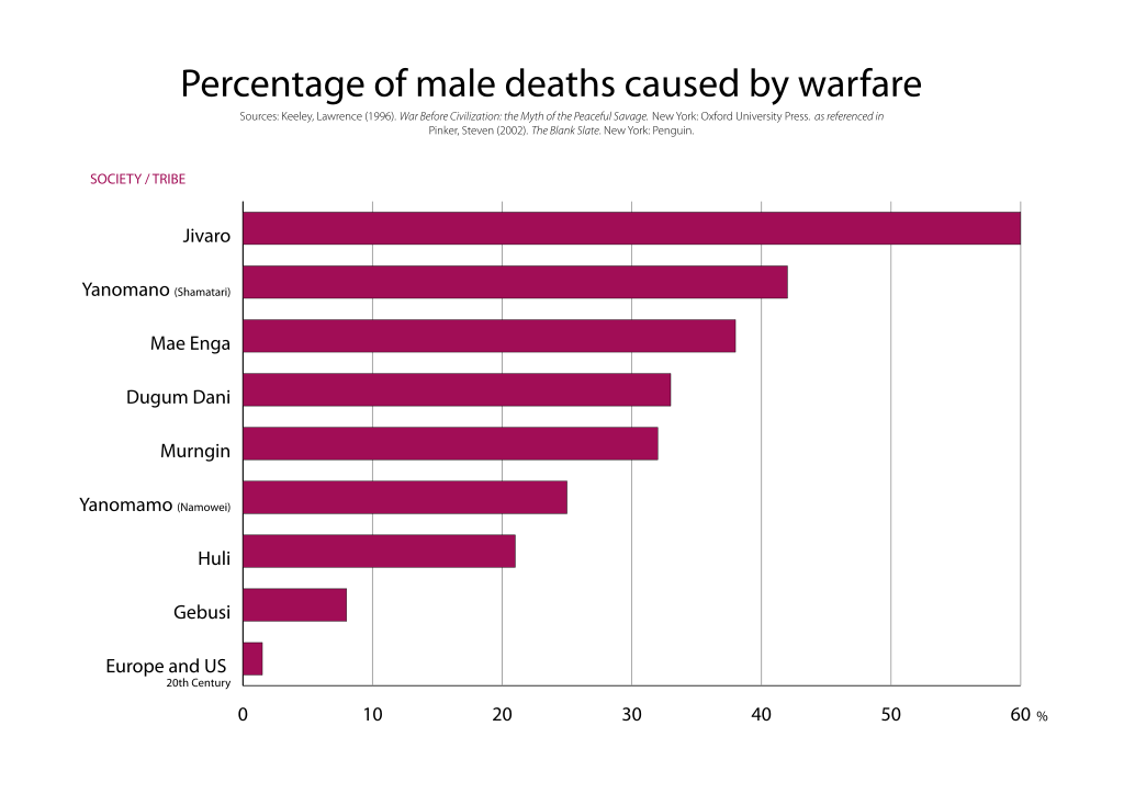 << Oorlog is een gewapende strijd tussen volkeren of staten. Als etnische of religieuze groepen binnen dezelfde staat met elkaar een gewapende strijd voeren spreekt men van een burgeroorlog. Men spreekt van een wereldoorlog als een meerderheid van de grootste en sterkste landen over de hele wereld bij de oorlog betrokken is. Oorlogen tussen staten onderling zijn tegenwoordig zeldzaam... >> << ... De definitie van oorlog is niet vastgelegd, er is wel gesteld door Richardson dat 1 dode een moord is en 1000 doden een gewapend conflict (oorlog op de klassieke manier van slagvelden is verboden door het internationaal recht en de term refereert hieraan). Singer & Small en Deutsch & Senghaas stelden voor om het over "oorlog" te hebben als het fenomeen voldeed aan de volgende drie criteria: Grootte: het resulteert in minstens 1000 doden op het slagveld (niet meegeteld de indirecte slachtoffers door hongersnood, gebrek aan onderdak en ziekten). Voorbereiding: het is van tevoren voorbereid en/of wordt onderhouden door grootschalige sociale organisaties door middelen als rekrutering, training en opstelling van troepen; de aanschaf, opslag en distributie van wapens en munitie. Legitimatie: het wordt gewettigd door een opgezette regeringsorganisatie, zodat de moord op grote schaal niet als misdaad maar als plicht wordt gezien. Daarnaast definieerde Eckhardt oorlog als "elk gewapend conflict waarbij een of meer overheden betrokken zijn en dat 1000 of meer slachtoffers per jaar kost". Ook stelde Frankel: "Oorlog lijkt in het algemeen alleen de grote conflicten in te houden, gewoonlijk tellen de conflicten waarin minder dan 50.000 strijdkrachten meedoen niet mee". Overigens waren ze het er allen over eens dat de telling van de doden zowel burgers als militaire slachtoffers inhoudt, maar Frankel telde ook de doden die indirect vielen ten gevolge van hongersnood of epidemieën en ziekten, en ook de oorlogsgerelateerde slachtingen... >> << ... In de prehistorie bestonden er waarschijnlijk al kleinschalige schermutselingen. De helft van de mensen die werden opgegraven in een Nubische begraafplaats van de Qadancultuur dat kon worden gedateerd op ongeveer 12.000 jaar geleden, was overleden aan geweld. Lawrence H. Keeley, professor aan de Universiteit van Illinois, zegt dat 90-95% van de samenlevingen die in de loop van de geschiedenis zijn bestudeerd, ten minste af en toe op oorlogspad gingen. Gemiddeld meer dan een derde van de Yanomamömannen uit het Amazonebekken overleed als gevolg van oorlogshandelingen. In sommige samenlevingen leefde men voortdurend in een sfeer van oorlogvoering. Zo waren er 633 gedocumenteerde gevechten tussen Maoristammen in de periode 1801 en 1840. Ondanks de onmiskenbare bloedbaden en de dodelijke effectiviteit van de moderne oorlogvoering blijkt uit dit soort onderzoek dat stammenoorlogen (percentueel) gemiddeld 20 keer dodelijker zijn dan de oorlogen van de 20e eeuw... >> (zie bijlagen) << ... Er zijn een aantal manieren om oorlogvoering te categoriseren. Eén categorisering is conventioneel tegenover onconventioneel, waarbij conventionele oorlogvoering goed geïdentificeerde en bewapende krachten impliceert die elkaar bevechten op een vrij open en ongecompliceerde manier zonder massavernietigingswapens. Onconventioneel verwijst naar andere soorten oorlog die elementen als inval, guerrilla en terrorisme kunnen omvatten. Deze categorie omvat tevens chemische of biologische oorlogvoering. Elk van deze categorieën vallen gewoonlijk in één van twee bredere categorieën: hoge intensiteits- en lage intensiteits-oorlogvoering. De hoge intensiteits-oorlogvoering is tussen twee grootmachten of grote landen die voor politieke redenen vechten. De lage intensiteitsoorlogvoering impliceert guerrillaoorlogvoering en gespecialiseerde soorten troepen die om revolutie vechten... >> Waar hebt ge het nu nog moeilijk mee?