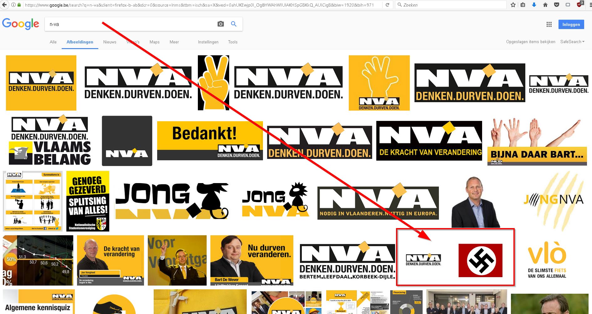 Ik begrijp het wel. Mensen maken associaties aan. Dat is de hele reden dat we bijvoorbeeld verkiezingsposters hebben. Je leert er geen zak van over standpunten of kandidaten, maar je legt wel de associatie dat er hier in de buurt nog iemand is die partij wil stemmen, en dat is een prettig idee. Met een hakenkruis tussen je google resultaten, zeker voor een rechtse partij met wat ideeën omtrent minder immigratie, gaan mensen ook een associatie leggen, namelijk dat er hier in de buurt nog iemand is die de N-VA nazi's vind. De afbeelding in context legt die link niet door de manier waarop de twee gebruikt worden, het is in het in het belachelijke trekken van een ander argument dat de associatie legt dan N-VA'ers Vlaams Blokkers zijn. De post zelf helpt wat dat betreft de N-VA juist door dergelijke associaties die ze niet willen hebben te ondergraven. Maar uit context, de manier waarop de meeste mensen het zien, is het een ander verhaal.