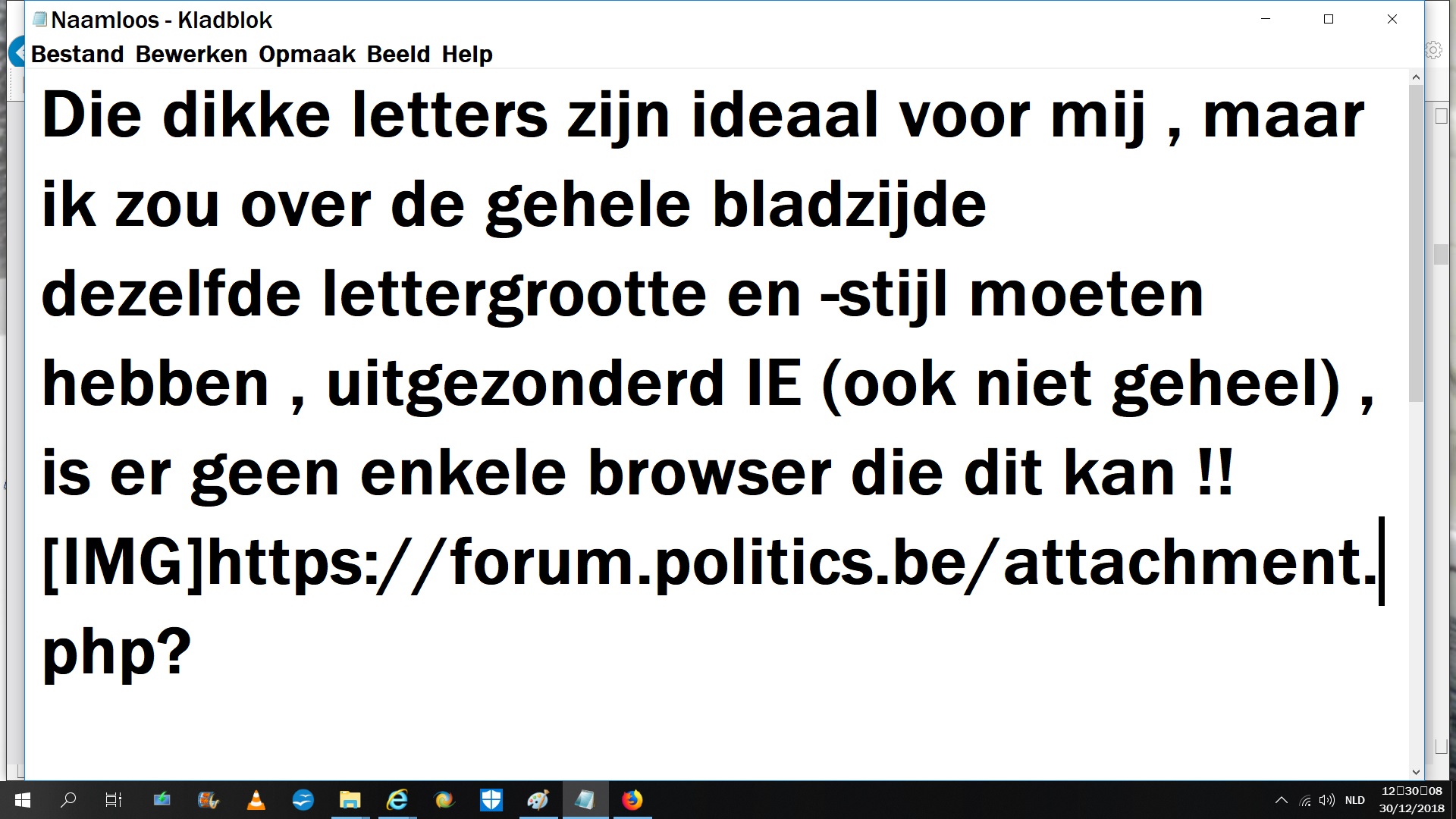 Iexplorer is al wel redelijk passé. Beeldschermloep gebruiken? In IE kan je bij de instellingen het %'tage toch hoger zetten, normaal staat dat op 100% geloof ik maar je kan verder door of tot 400%, geen idee meer van. Vroeger een huurder gehad die een speciale pc/software had (duur) omdat hij slechtziende was. Ook een collega op een werk, die zo goed als bijna volledig blind was las zelfs boeken weergegeven in een enorm groot letters & cijfers. (software of hardware naam vergeten) Er zijn Internetsgewijze ook best redelijk wat big letter generators te vinden. Voor 'alles' is er een oplossing? ![]()