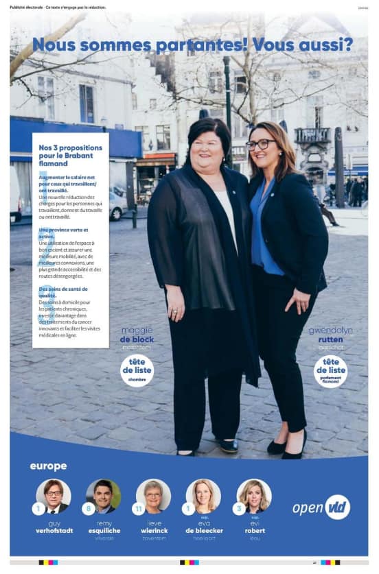 Niet alleen zij er dagelijks ongeveer 400 soorten medicatie in de Belgische apotheken niet verkrijgbaar, dank zij de prijzenpolitiek van "ons Maggie" ,maar nu voert zij samen met Gwendolyn ook nog eens een Franstalige campagne in Vlaams Brabant. Franskiljonse Open-VLD is dus terug de aloude PVV=Pest Voor Vlaanderen. Advertentie in Le Soir voor Franstaligen in Vlaams-Brabant. Eéntalig in het Frans. Foei Maggie en tot nooit meer. Wat moet haar broer daar nu van denken ? Die mens hield als burgemeester van Merchtem indertijd nog een actie tegen Franstalige reclame boodschappen op de markt van Merchtem. Laatst gewijzigd door Witte Kaproen : 18 mei 2019 om 15:51. |