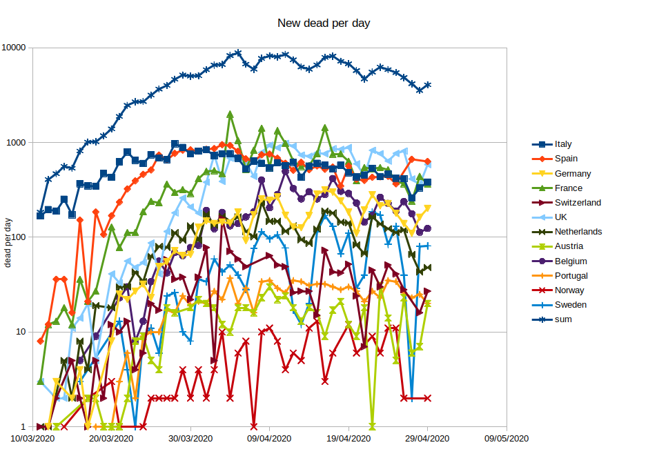 Het verbazende is weer de standvastigheid van de tendenzen. De Spaanse getallen zijn misleidend: dat is nu al 4 dagen dat die maar om de 2 dagen rapporteren, en dus ongeveer het dubbele aangeven (som van twee dagen). Ik weet niet of dat systematisch zal worden. Laatst gewijzigd door patrickve : 30 april 2020 om 04:40. |