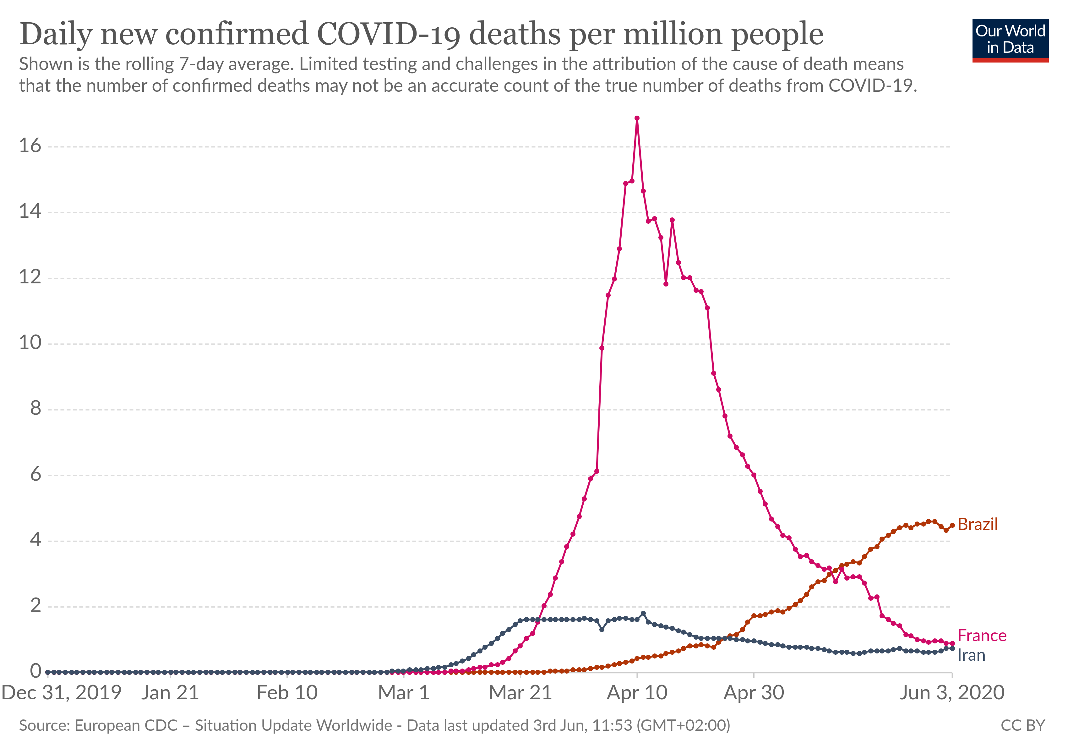 Het merkwaardige is eerder dat het verloop zo enorm gelijklopend is (op factoren na). Wat we zien in Brazilie, is dat de epidemie VEEL EN VEEL TRAGER van de grond is gekomen, misschien omdat het ginder zomer was toen het bij ons piekte. Maar we zien nu ook dat het aantal doden per dag aan het afvlakken is. Nochtans kan men niet zeggen dat Brazilie in een algemene lockdown is. Enkel Belgie piekte wat steviger, maar de algemene tendens is overal vergelijkbaar: een aanvankelijk exponentieel stijgen, dan een ombuigen, door een maximum gaan, en dan afnemen. De grootte-orde van het maximum situeert zich rond de 10 doden per dag per miljoen inwoners. Belgie piekte daar twee keer boven, Brazilie lijkt het 2 keer minder hoog te hebben, maar dat zijn kleine details. Het lijkt erop dat Brazilie veel meer "de piek uitsmeert" dan landen die dat met een lockdown wilden doen. Iran heeft een raar verloop: het "platte dak" lijkt eigenaardig bij de piek. Het lijkt erop alsof zij aan hun tweede golf beginnen, maar ik heb een beetje twijfels bij die cijfers. Die in elk geval belachelijk laag zijn, 10 - 20 keer kleiner dan in Belgie. Laatst gewijzigd door patrickve : 3 juni 2020 om 13:16. |