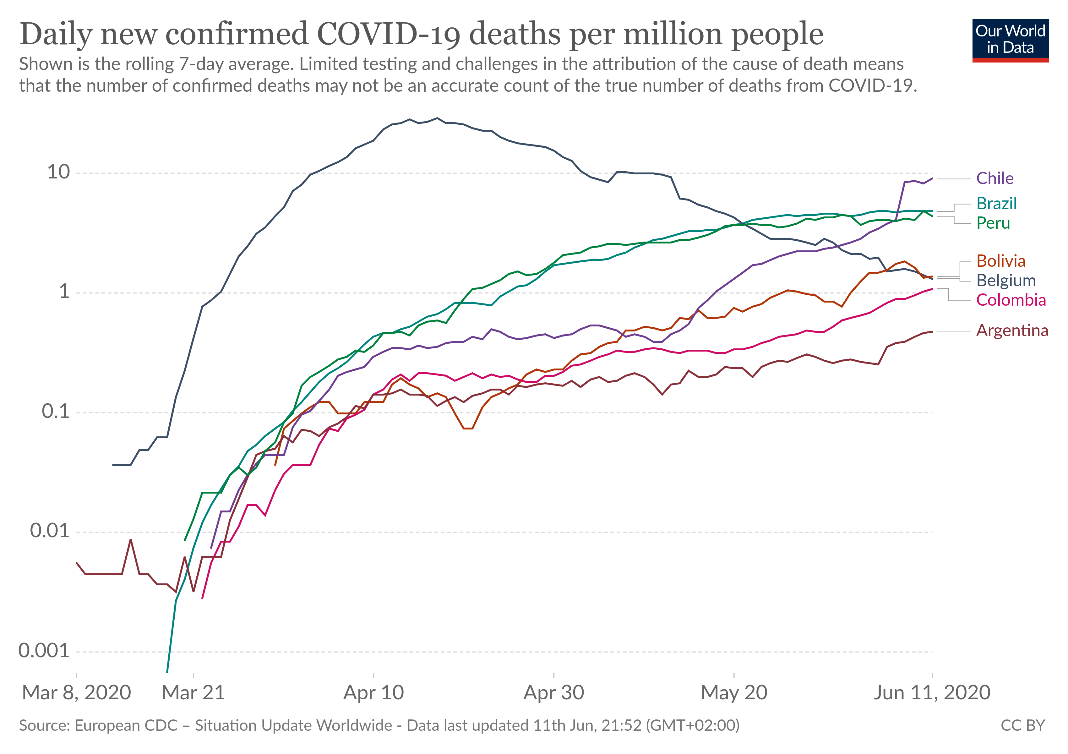 Merk het gelijk lopen van Peru (strenge lockdown) en Brazilie (bijna nergens een lockdown). Weerom stelt men vast dat die lockdown of niet, weinig verandert. Bij hen lijken ze echter stilaan een heel traag plafond te bereiken, terwijl de meeste anderen nog op een stijgende lijn zitten. Maar merk vooral hetzelfde gedrag op bijna overal in die Zuid-Amerikaanse landen. Ter vergelijking heb ik er Belgie bij gezet als "referentie": zij zijn bijlange nog niet toe aan onze piek (bovendien op log schaal). Het zou kunnen dat zij, door de omgekeerde klimaatstoestand ginder, een sterke "flattening the curve" krijgen. Misschien is dat ook de verklaring waarom Zweden en Canada nu trager dalen, zij hebben een minder sterk "zomerweer" op dit ogenblik. Een argument kan het klimaat zijn, het is ginder zacht begonnen omdat zij toen op het einde van de zomer zaten, toen het bij ons hevig startte, en nu gaan zij de winter in, en neemt het ginder licht toe. Dat kan een illustratie zijn van wat ons in het najaar te wachten staat. Laatst gewijzigd door patrickve : 12 juni 2020 om 04:16. |