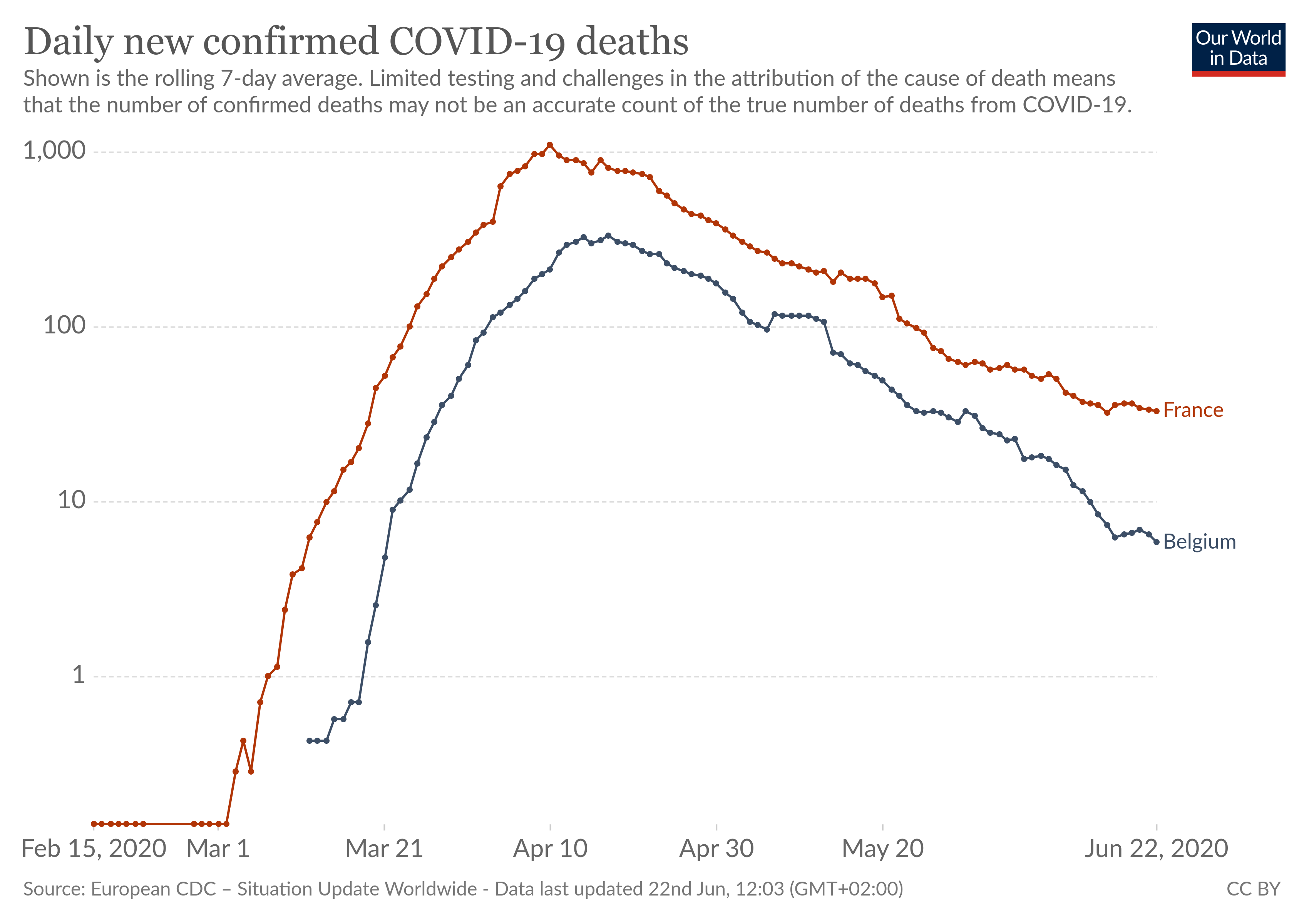 Welnu, dat is inderdaad wat men waarneemt. Het percentage ten aanzien van besmetten is misschien laag, maar veel constanter dan "vastgestelde besmettingen met een test" die bijzonder variabel zijn. Kijk naar Frankrijk (in Belgie waren de absolute cijfers inderdaad wat laag en veel ruis erop). Je ziet duidelijk dat de ombuiging (de verandering van helling van de raaklijn) al begint voor 1 - 7 april. Die sprong rond de 1 april is omdat ze vanaf dan de rusthuis doden gaan meerekenen zijn. Je hebt geen rechte lijn, die pas BEGINT om te buigen vanaf 1-7 april, he. Je ziet dat een min of meer parabolische vorm aangenomen wordt. Maar ook met ziekenhuis opnames had je dat. Die begon al flink af te nemen (de logarithmische afgeleide) vanaf 15 maart. Ik heb het plotje in mijn paper gezet trouwens. |