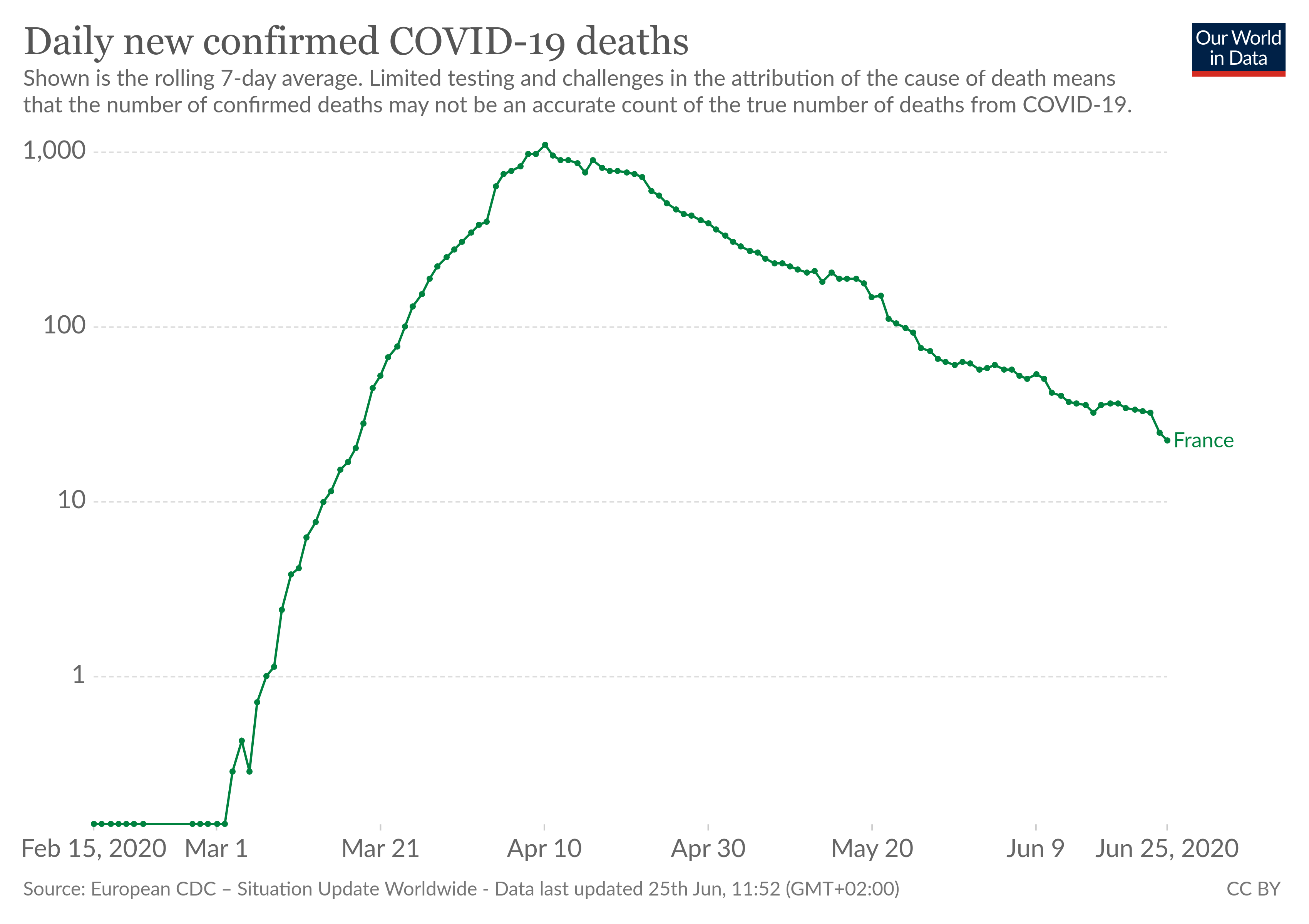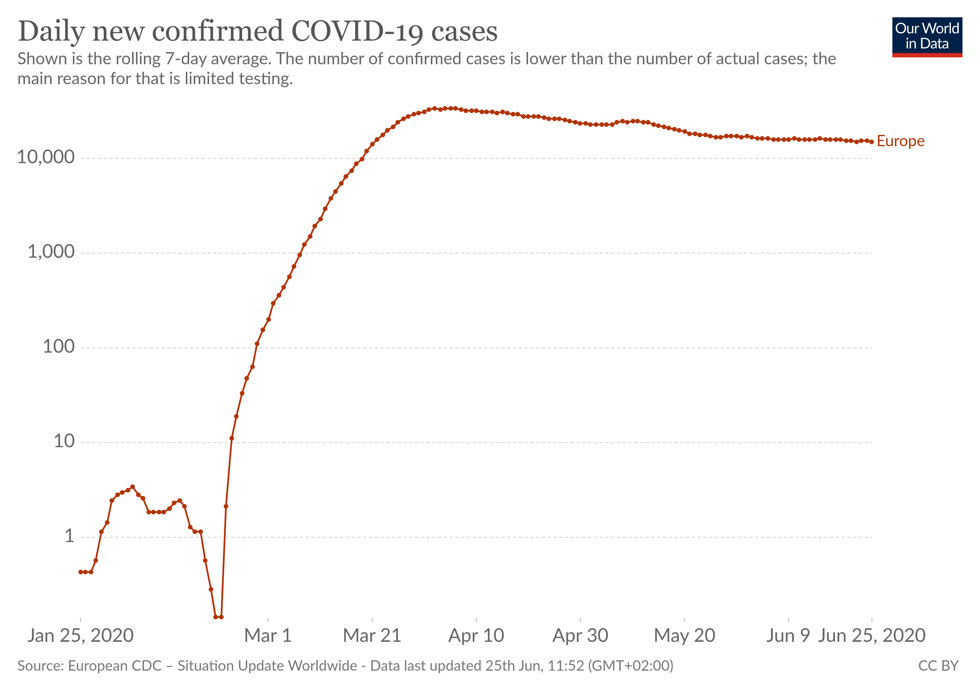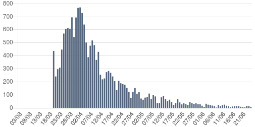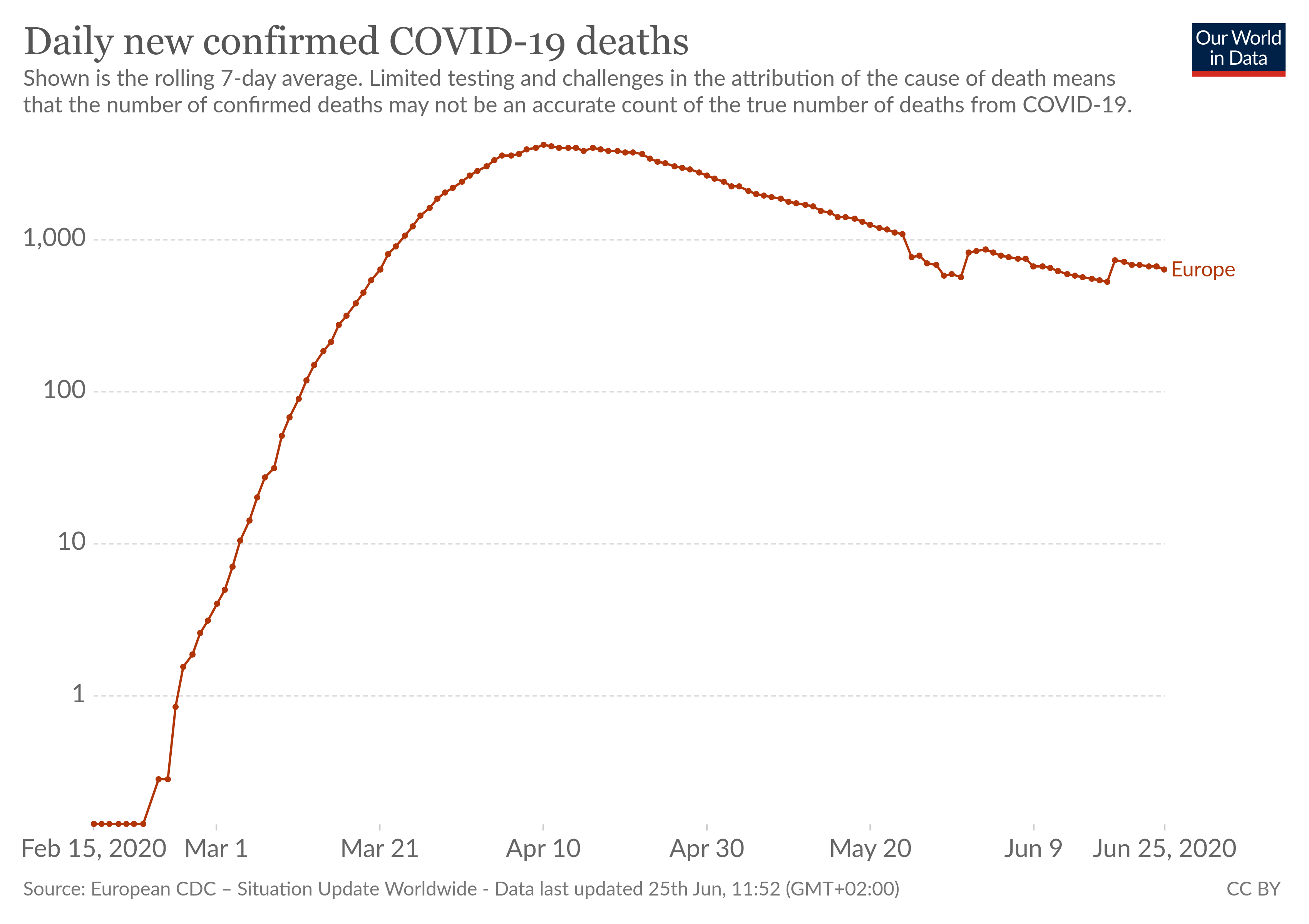 ![]() We zien trouwens hetzelfde effect op Europees niveau: de hellingen van "bevestigde gevallen" en "doden" lopen niet gelijk, sinds lang.
