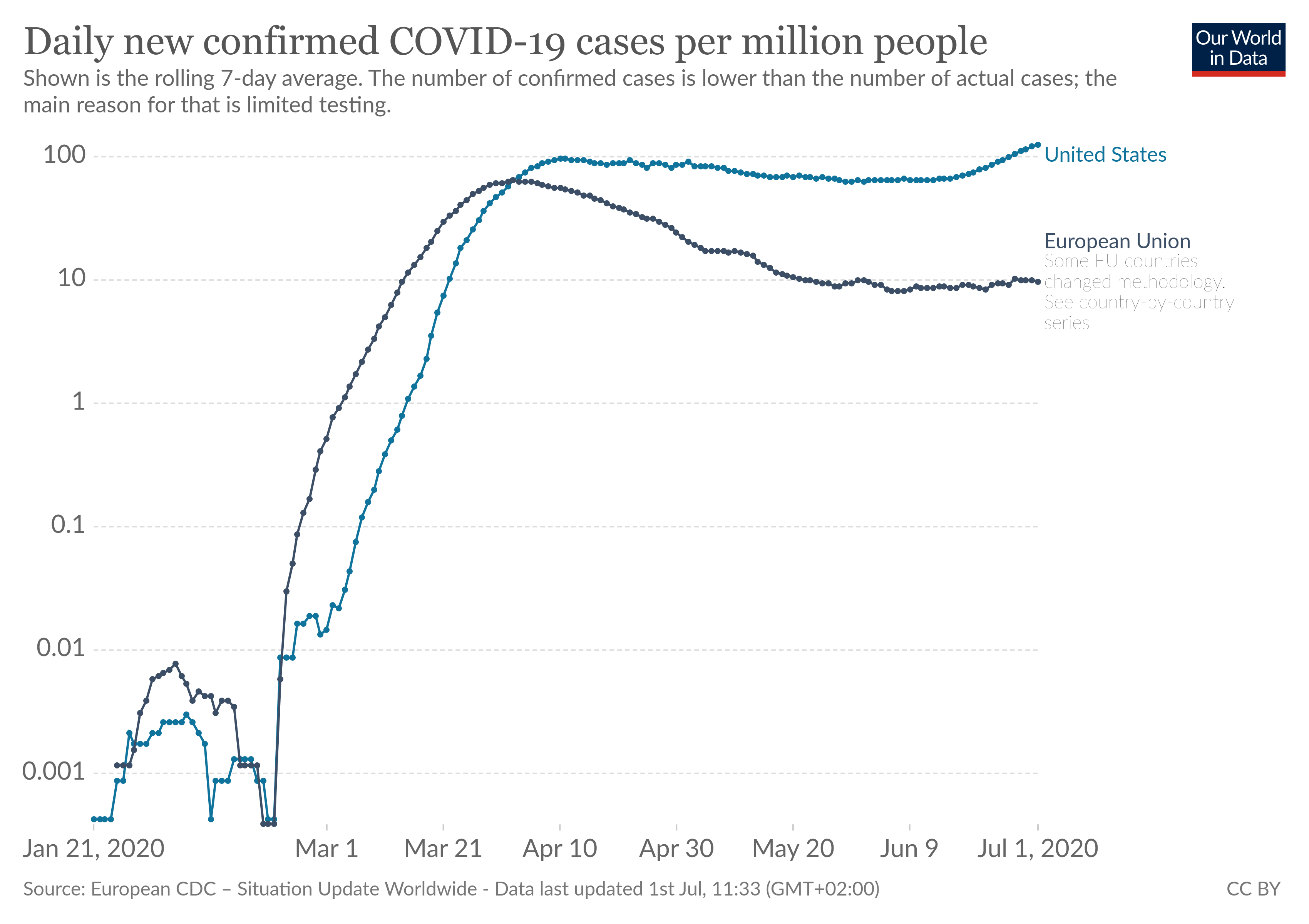 In de US is er dankzij Trump een complete chaos. Hij moedigt zijn aanhangers zelfs aan om hun voeten eraan te vegen (terwijl hijzelf draconische maatregelen neemt om zelf niet besmet te geraken). Het resultaat staat in de grafiek. Ze hebben terug een exponentiele stijging.
