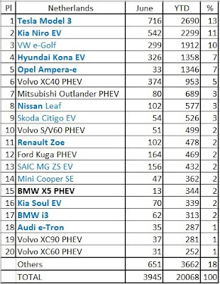Tabel 6 maanden 2020 (YTD) Tesla haalt pas in de eindsprint van juni nog de Kia Niro in. (de 2 boten waren pas vanaf 23 juni aangekomen in Zeebrugge door de pandemie) Model 3 blijkt ook nog de best verkochte middenklassewagen, ook de ICEs halen het niet, ook niet de modellen die ICE en PHEVs combineren, zoals BMW 3, Volvo S/V60 en Mercedes C. Audi A4 - enkel ICE - was pas vijfde. De cijfers spreken voor zich. Citaat: