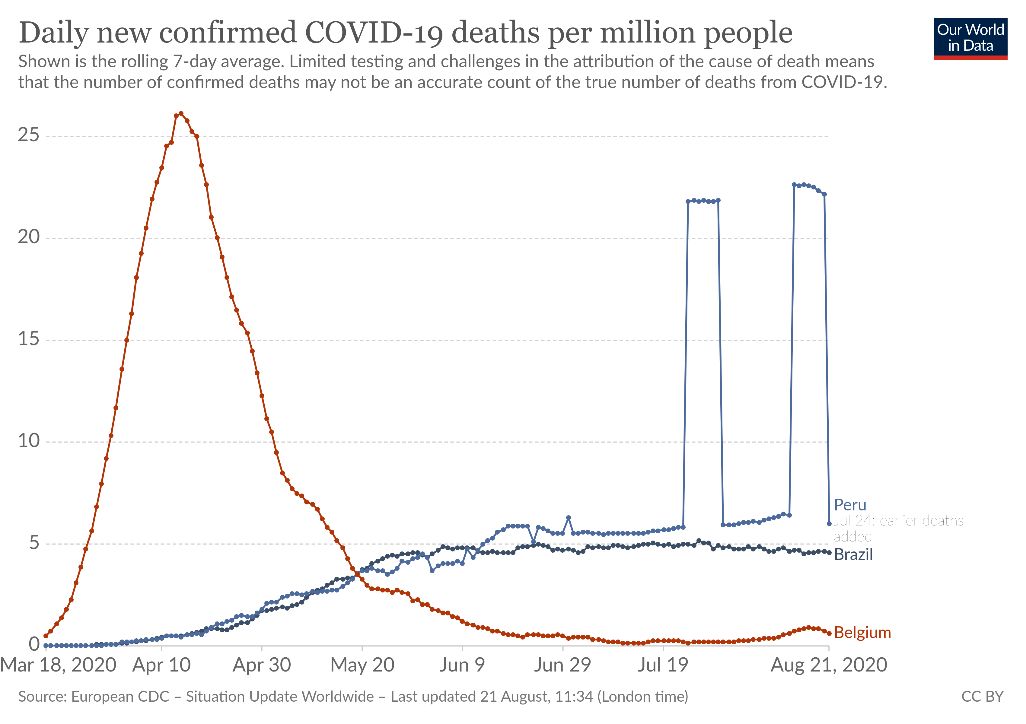 ![]() Nog even een lockdown en een niet-lockdown land (twee buurlanden) met elkaar vergelijken. Peru = lockdown land, Brazilie niet-lockdown land.