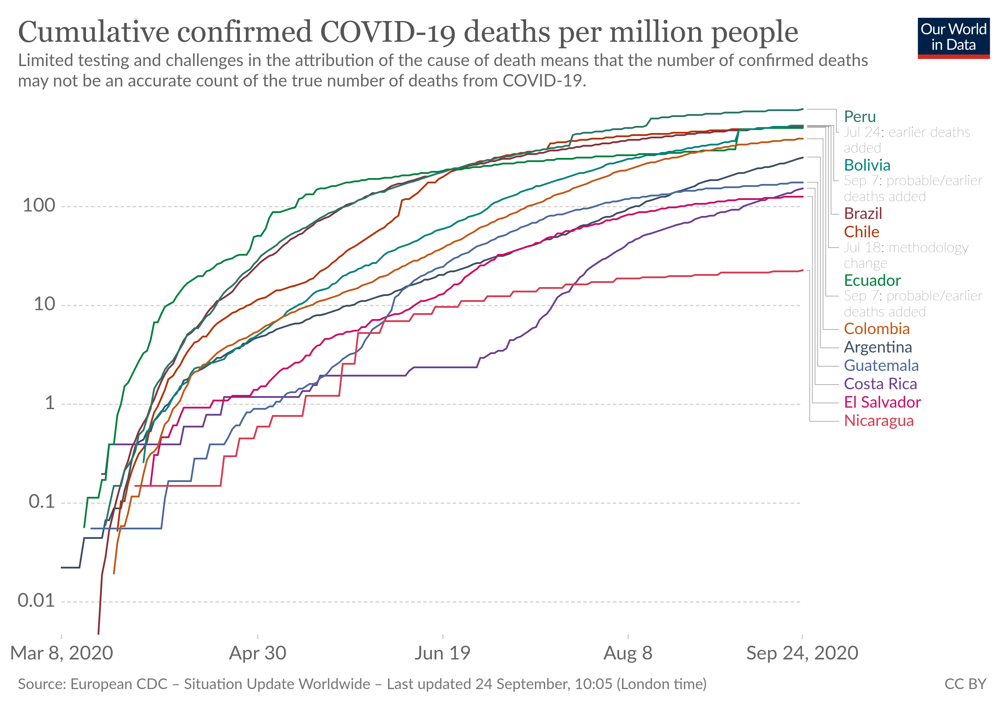 Om het voorgaande te illustreren, kijk eens naar de vergelijkbare convergenties in Zuid-Amerika en Europa, ook al zijn de *verlopen* totaal anders. Het zijn totaal andere landen, andere maatregelen, ander klimaat. En het eindresultaat is vergelijkbaar: we zien resultaten van enkele tientallen tot enkele honderden doden per miljoen inwoners, en die die onderaan zitten, hebben neiging om weer serieus gaan te stijgen. Maar merk op dat het streven naar die resultaten totaal anders is verlopen: in Europa met een heel snelle stijging in het voorjaar, en in zuid-amerika veel geleidelijker, en sommigen zijn later begonnen dan anderen.