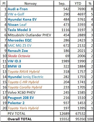 September Noorwegen: PEV of stekkerwagens 82 % marktaandeel, BEV 62% maarktaandeel!