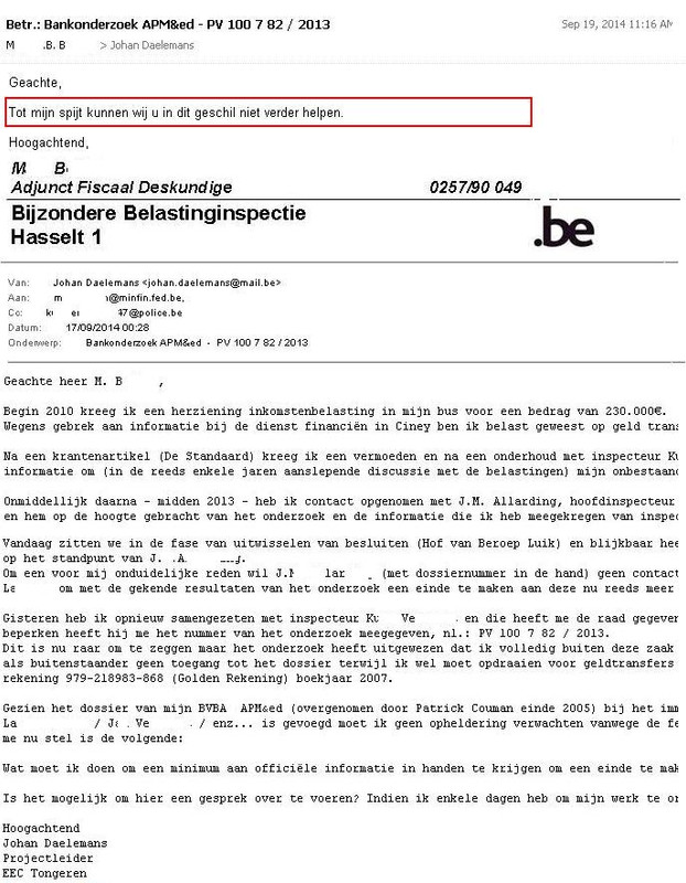 Nergens is mij iets ten laste gelegd na de overname einde 2005. Via een foutieve enorme omweg, (mogelijk bij aanvang onbedoeld door onkunde, later bewust ) valsheid in geschrifte, opstellen van een vals PV, manipulatie van dossiers na datum, schuldig verzuim (alle beleidslagen van fiscus) vechten wij vandaag nog steeds om de fiscus te dwingen om de juiste persoon bij het juiste tijdvak te plaatsen. Hoe moeilijk kan dat zijn? Eerlijk gezegd, doodsimpel. Waarom gebeurt het niet? Omdat een hele bende ambtenaren buiten schot moeten worden gehouden. Topmensen bij de BBI hebben ook vandaag nog het hele dossier voor hun neus liggen. Ik denk dat niemand hier gaat beweren dat die mensen niet kunnen lezen. Op aanraden van de GP van Mechelen heb ik contact opgenomen met de BBI van Hasselt die het fiscaal dossier beheerden. Dit was het antwoord; " Wij kunnen u in dit geschil niet verder helpen" ![]()
