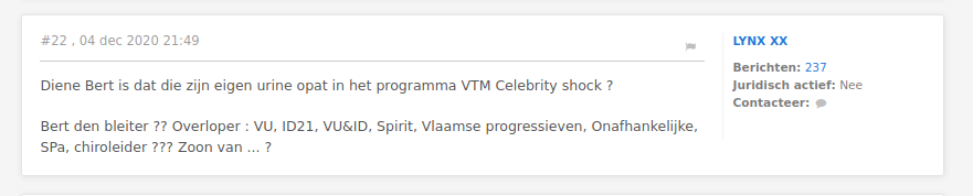 Om enige conversatie mogelijk te maken Ik heb onder de naam van het hoofdpersonage me opnieuw geregistreerd en een antwoord geplaatst. Ik stel ondertussen ook vast dat de post een enorm aantal views trekt. Als ik de views naar deze draad bij de views op het juridisch forum tel dan kom ik aan zo'n 25.000 views per maand. https://juridischforum.be/viewforum.php?f=16