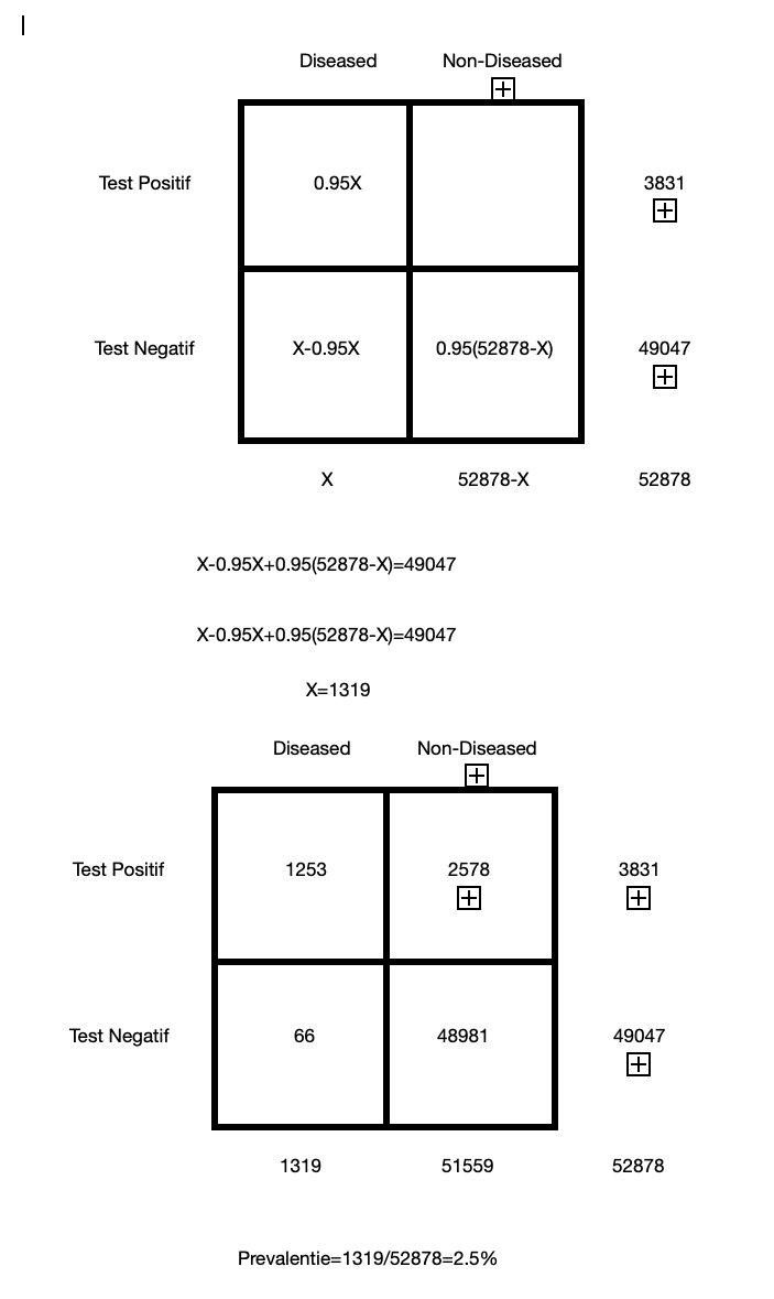 De "elisa" Aids test heeft specificiteit en sensitiviteit van 99%. En toch kan je zo een test niet op de volledige gezonde bevolking gebruiken. 60% van de positieve testen zouden dan onterecht zijn. |