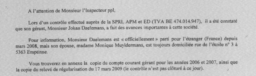 Hier nog even het bewuste stukje tekst, BTW- controle Ciney naar dienst inkomstenbelasting Ciney - doorgestuurd op 17 maart 2009. ![]() Vrije vertaling: Ter attentie van de inspecteur persoonlijke inkomstenbelasting, Naar aanleiding van een BTW-controle op de vennootschap APM&ed bvba is er vastgesteld dat de zaakvoerder ' mijnheer Daelemans Johan, belangrijke voorschotten heeft gestort naar deze vennootschap. Bijkomende informatie, mijnheer Daelemans is 'officieel verhuist naar het buitenland (Frankrijk) sinds maart 2008 maar zijn vrouw Monique Muyldermans woont nog steeds op het adres , Rue de l'étoile 3 in Emptinne. In bijlage vind u een kopie van de lopende rekening voor het jaar 2006 en 2007, evenals de voorgestelde regularisatie van 17 maart 2009 (deze BTW-controle is nog steeds niet afgesloten). Uw link https://juridischforum.be/viewtopic....68952c4906b15d verwijst naar de discussie op het juridisch forum aangaande de door de fiscus gebruikte term van de benaming "zaakvoerder" gekoppeld aan een verkeerde persoon. Wat me ook verwonderd is dat de draad blijkbaar nog online staat maar uit de zoekmachine is verdwenen. Hij staat er dus nog maar is voor mensen die er achter zoeken niet toegankelijk. De vraag zelf is op het juridisch forum nooit echt beantwoord. Uiteindelijke opmerking van een forumlid ... de fiscus mag alles en moet niks... punt.