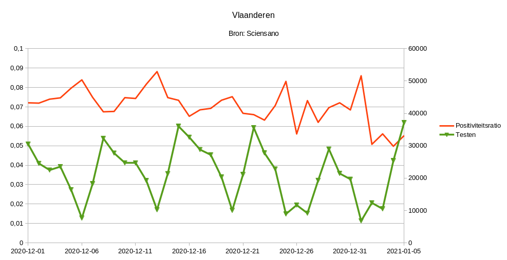 Voor Vlaanderen bekeek ik het totaal aantal uitgevoerde testen, en de ratio positieve testen. Dat geeft deze grafiek: ![]() De datum is de datum dat het laboratorium de analyse heeft uitgevoerd, en de laatste dag (5 januari) zien we het aantal testen scherp stijgen. Vermoedelijk is dat het effect van de terugkerende reizigers afgelopen weekend. Maar wat me ook opviel: enkele dagen eerder is de positiviteitsratio plots en scherp gezakt, van schommelend rond de 7 procent tot net boven de 5. En vervolgens blijft het (tot nu toe) net boven de 5 procent. Heeft de eindejaarsperiode er iets mee te maken? Maar dan had ik eigenlijk juist verwacht dat vooral ernstige gevallen getest zouden worden - en dus een hogere ratio. Op 1 januari en 25 december zien we dat ook. Of is er iets gewijzigd aan de teststrategie? Laatst gewijzigd door gertc : 7 januari 2021 om 09:38. |