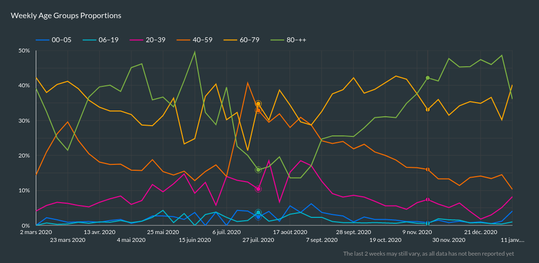 ![]() Je ziet de percentages per week en op pagina 1 kan je periode instellen. Als ik een keer tijd heb zal ik in mijn excel file het aantal personen per leeftijd uittellen per week.